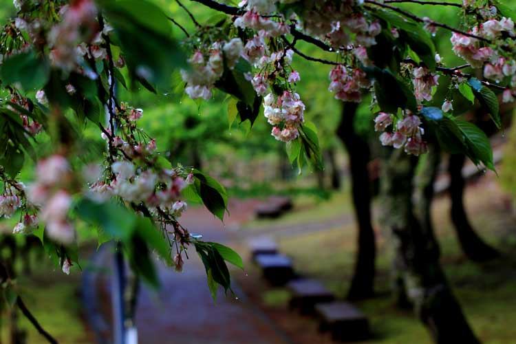 葉先に水滴が光り、八重桜静かに落下を待つ、生と死の峻厳な空気