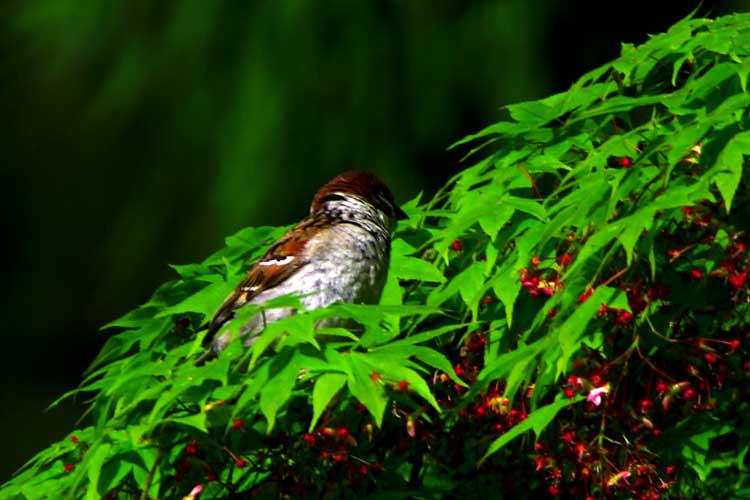 青々としたモミジ葉の中に遊ぶスズメ、少しは休んだらいいのに