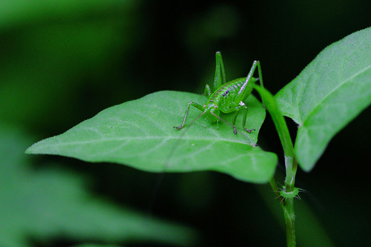 葉と同じ色のバッタはよく見ないと見過ごす、夏に向けて昆虫が活発に活動開始