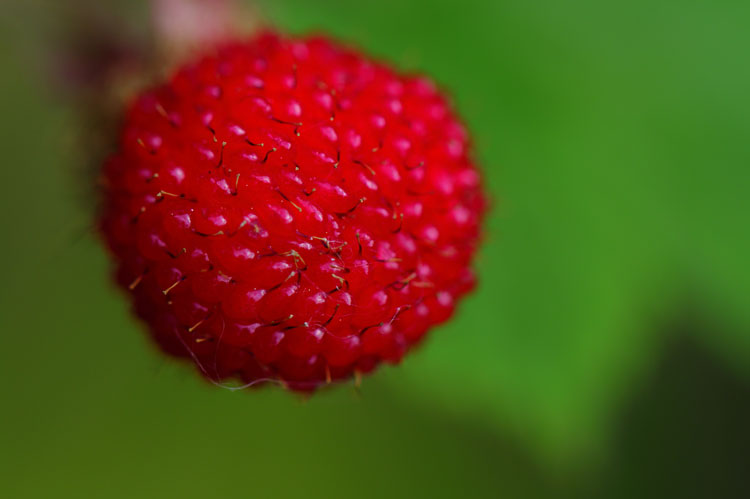 真っ赤な実をつけた野苺、表面にたくさんの雌しべが見える