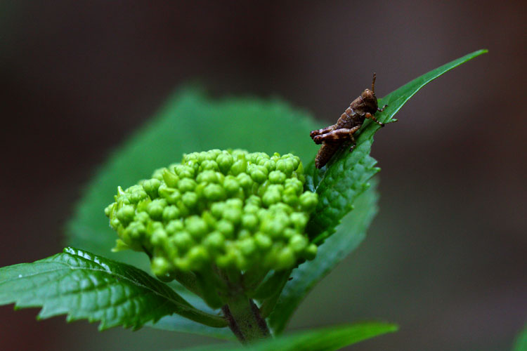 ホンアジサイの蕾、綺麗な花が咲きそうですね、バッタくん