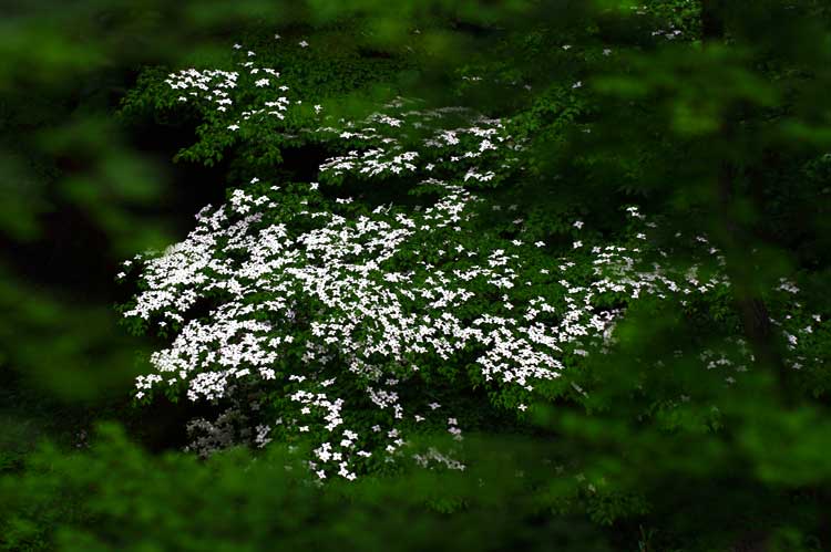 木々の間から垣間見る大きなヤマボウシ、岩清水