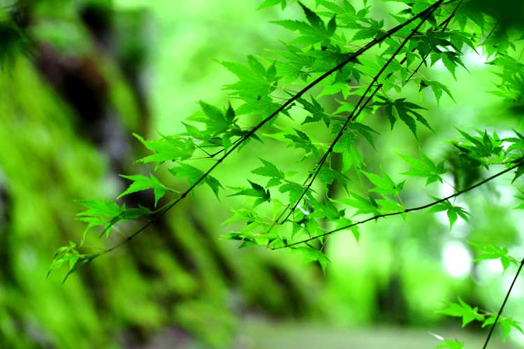 気持ちのよい緑の中、忠魂碑参道、岩肌に苔