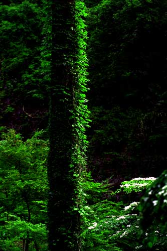 背の高い大木にどこまでもからまる蔦、右下に白いヤマボウシ、岩清水横