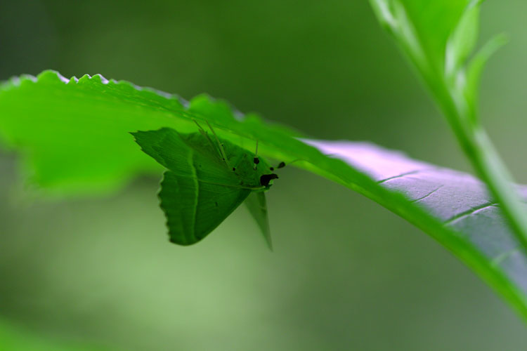 偶然葉の裏側に目が、葉にそっくり擬態の蝶・蛾?、近寄っても逃げない