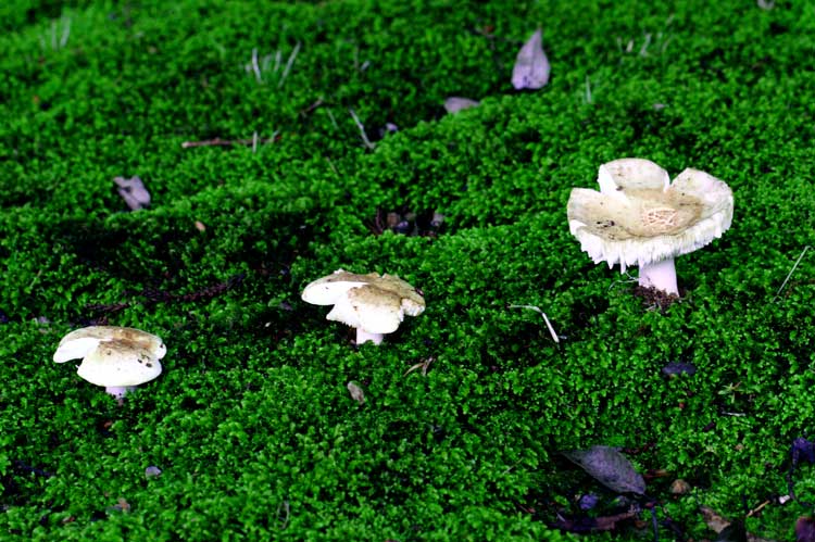 あちこちに白いキノコがニョキニョキ顔を、詳しくないので近づかない