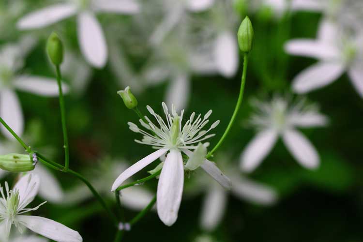 四枚の白いはなびらに見えるものは萼片(がくへん)で、仙人草に花弁はない