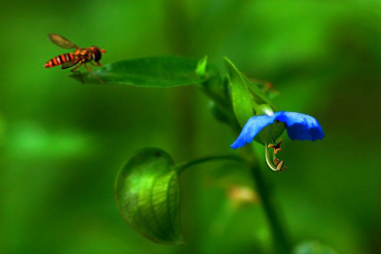 小さなツユクサがあちこちに、ハチと間違えそうヒメヒラタアブ
