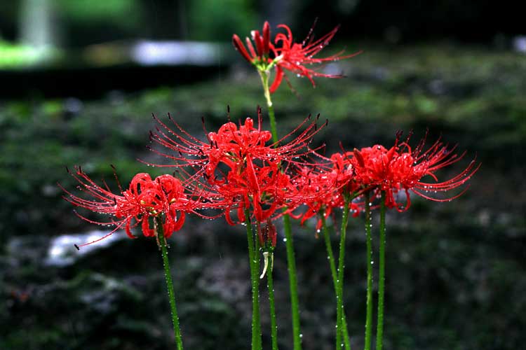傘にあたる雨音を聞きながら、まだほとんどのヒガンバナは蕾状態の中、開花