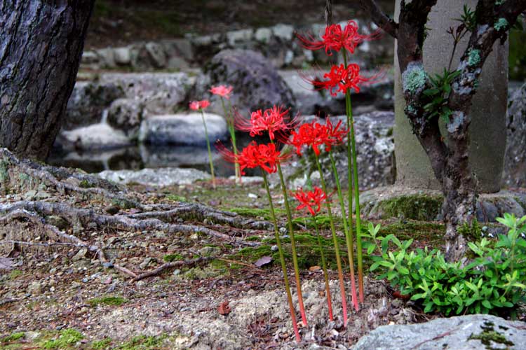こんなに上のほうまで赤いヒガンバナの茎は初めて見る
