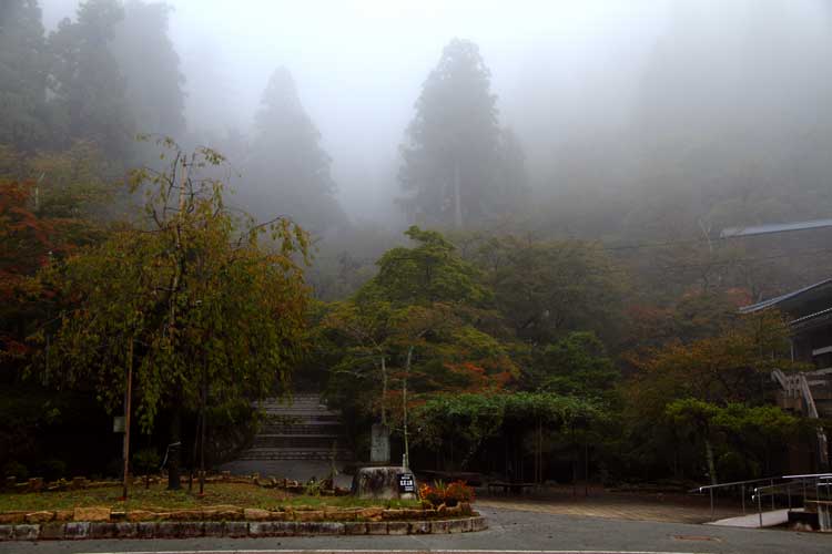 今朝は長く朝靄がかかる、公園玄関、少し紅葉も見え幻想的雰囲気に包まれる