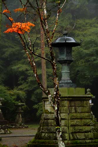 金燈籠横のもみじ、少ない葉なのにかえってインパクト