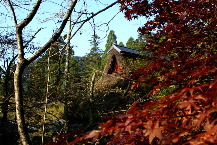 のどかな秋風景、かやぶきと紅葉、雲ひとつない秋晴れ