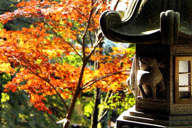 春日灯篭の鹿は神の使い、もみじ背景がよく似合う、