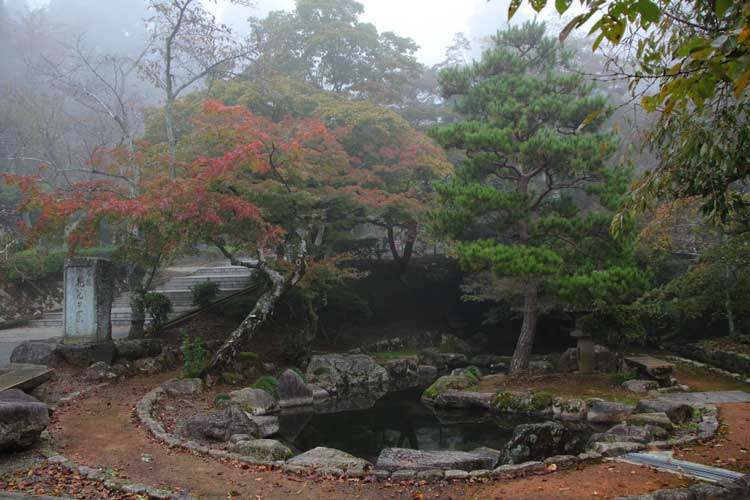 まだ朝霧の深い中、お泉水、もみじの色つきも目だつ