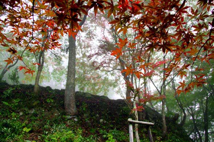 忠魂碑一歩手前の山道、もみじ葉を眺めながら上を見上げる