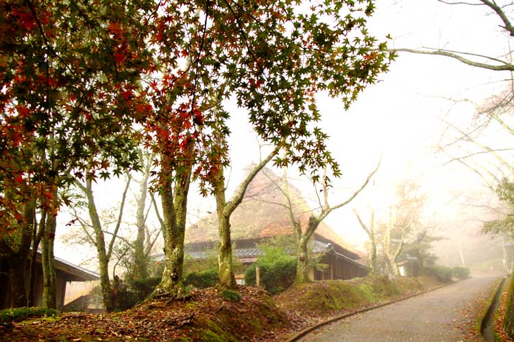 もみじの紅と青葉の入り混じる風景の中、濃い霧のかかるふるさとの家