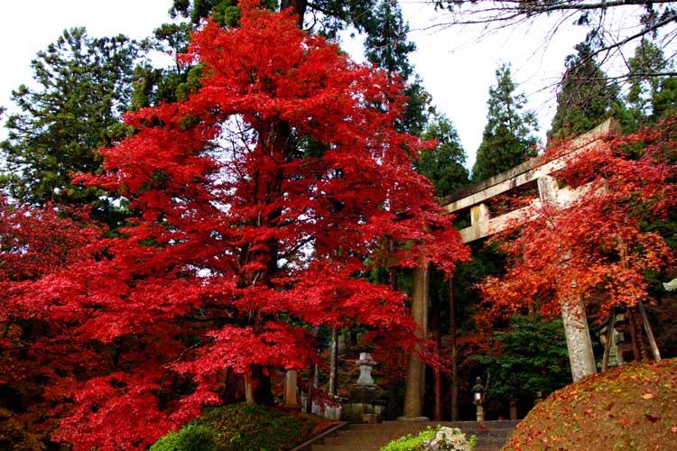 本殿石段横の大紅葉、雨間をぬって