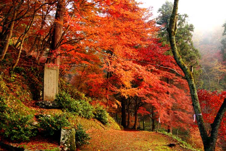 霧の中、紅葉の美しさ、石碑が語りかける日本の秋