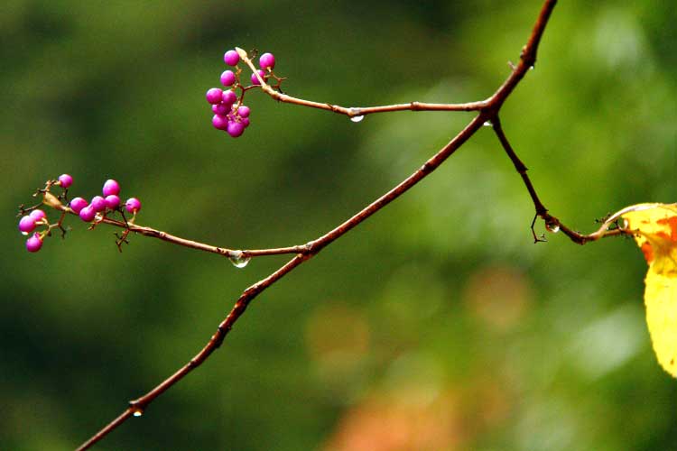 紅葉の遊歩道、ふっと目がいく、しずく垂れ綺麗な小紫の実