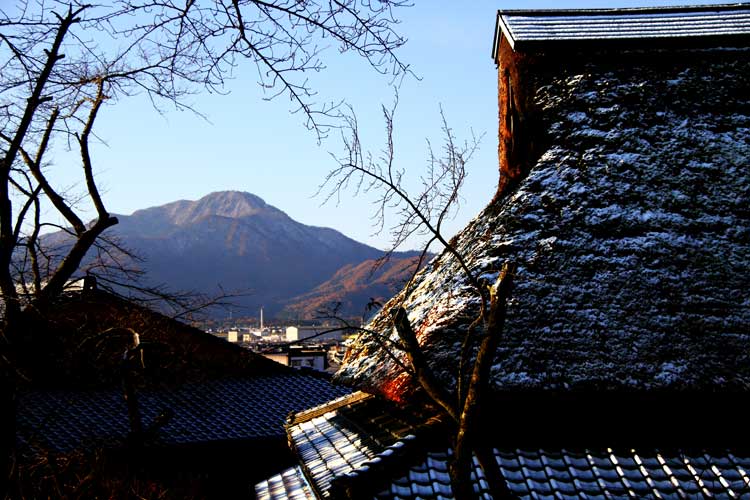 初雪、ふるさとの家かやぶき屋根と背景に越前富士(日野山)