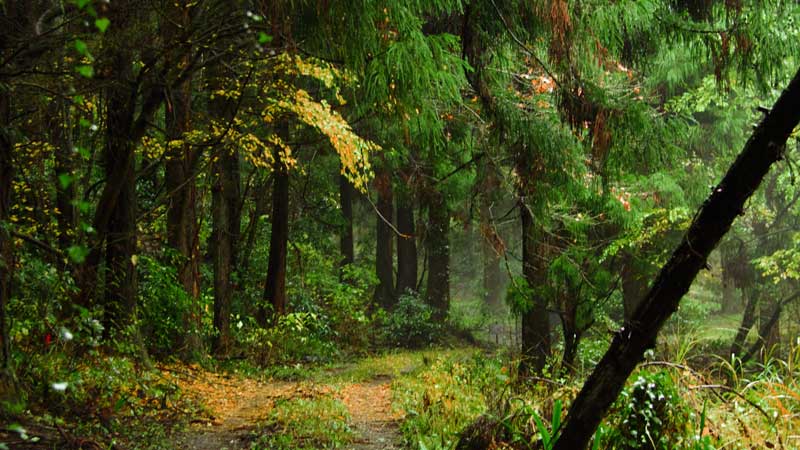 杉の林の中一枝の紅葉、この向こうに檻、当番、13日間捕獲ゼロ、みぞれ降る中、傘を差しながら