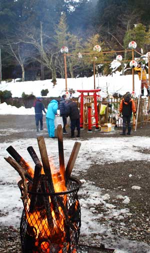 コロナ影響下、左義長飾も規模を縮小、お祓いなど神事はいつも通りと有志の方々。2月の伝統行事