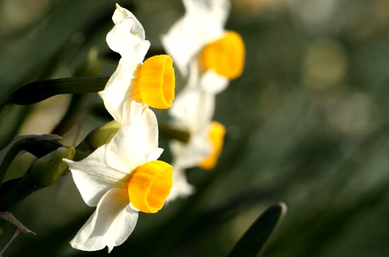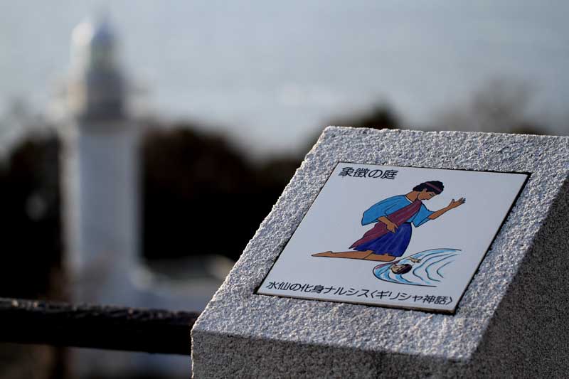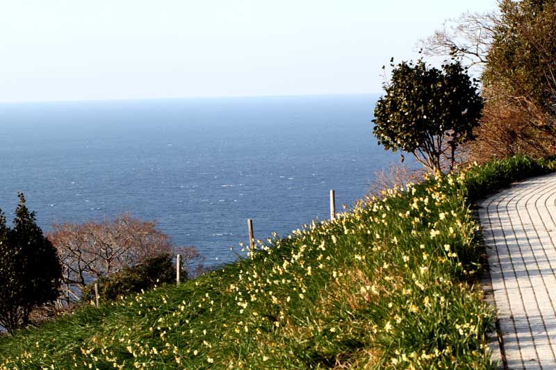 強風に倒されたのか茎が横になったものがほとんど。それでも難を逃れた水仙の群集もたくさんあり楽しめる。やっと冬を脱したかのような真っ青な海を背景に水仙が一段と鮮やか。水仙の化身ナルシスという石板、そこから見る灯台がきれい。