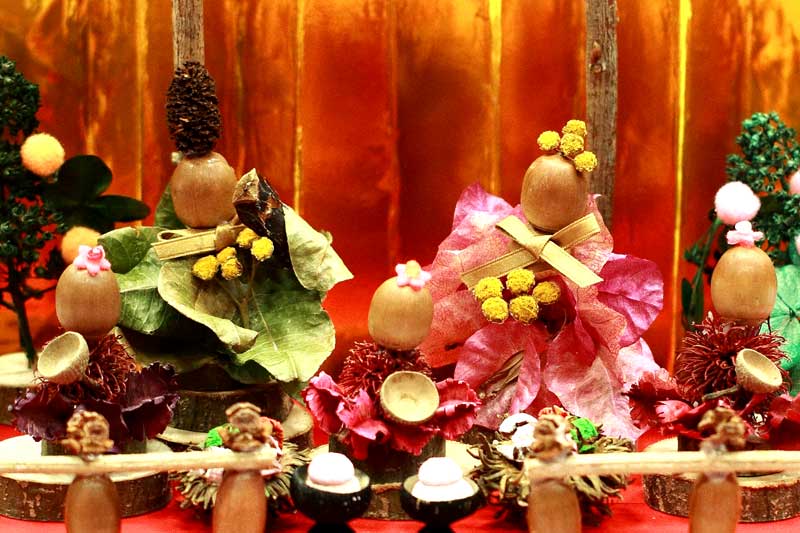 プラントピア朝日へ。なんとドングリで作ったお雛様が展示。おお綺麗と見ていると作者が、お聞きすればここのスタッフ、それにしてもよく出来ている。どんぐりの帽子のお椀がまたかわいい。見入っていると