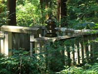 楠木正成公墓塔延元年間(約六百五十年前) 当社は後醍醐天皇の建武の中興に際して、北条氏の一族を大野郡牛ケ原に攻め滅ぼすなど、官軍との関係が密接であった。古い縁起によると楠木正成公の甥恵秀律師(えしゅうりつし)は平泉寺衆徒の一人で、延元元年(一三三六)当社三之宮に参篭していると夢に大楠公が騎馬姿で現れ、不思議に思っていたが、やがて大楠公湊川戦死を聞き知るにおよんでそれがまさに夢見の日とわかり、その場所に五重の石塔を立てて菩提を弔った、と伝える。周囲の石柵と参道は寛文八年(一六六八)越前藩主松平光通(まつだいらみつみち)公の奉納によるものである。(楠木正成公墓塔横案内板) |