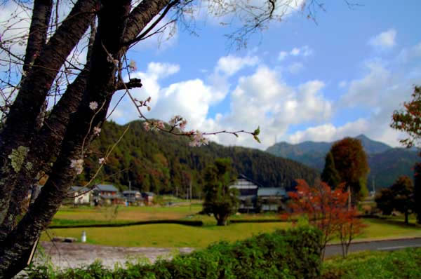 ゆったりとした景色の中、寒桜の咲く木が何本か