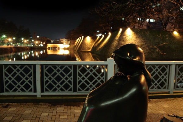 福井県庁お堀端のブロンズと夜景