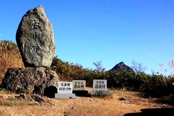 天気よく、冠山峠碑の向こうに冠山頂が見える
