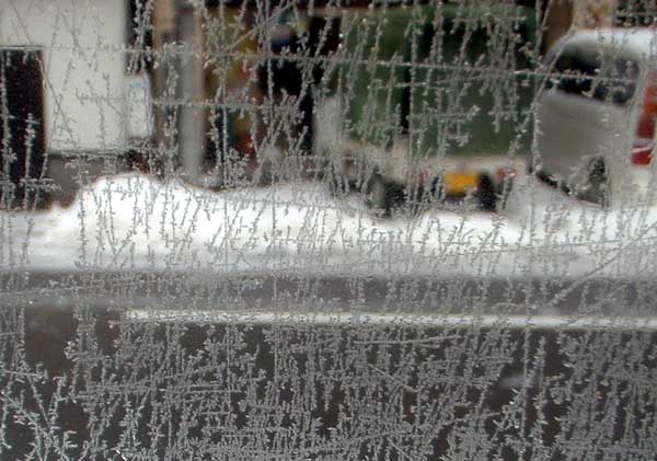 1aの降雪、晴れ間も。冷え込みでガラス戸に氷の結晶が。