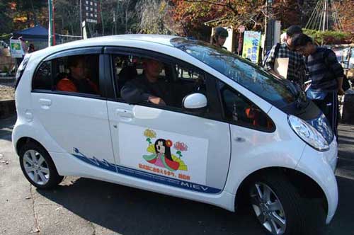花筐会館前で越前市職員の方にエコカー試乗を薦められ、早速運転。エンジン音が全くしないので、最初緊張。町内を走っていると、京都の方に呼び止められ、喫茶店まで案内するというハプニングも。加速の力はガソリン車より強いという印象。現在のところ家庭用電源なら14時間充電で100キロ走行可。気になる燃費はガソリンの1/8らしい。もみじまつり開会式直後であって周囲は混雑していたが、無事帰還することができた。2009 11/8